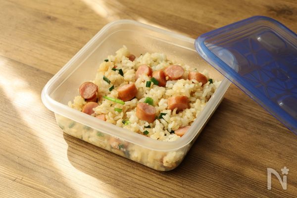 具材はご飯、ウインナー、青ねぎだけなので、思い立ったらすぐに作れる気軽さが魅力です。具材を保存容器に入れ、調味料とごま油を入れて全体を混ぜたら、電子レンジで加熱するだけ。洗い物も少なく、そのままお弁当に持っていけるので、忙しい朝にぴったりですよ♪