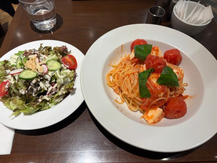 カフェのランチって「あれ、こんなもん?」みたいな量のことが多いけど、パスタの量も、トッピングのトマトとモッツァレラチーズの量もしっかりある。コッテリ系のパスタにしなくてよかった〜!