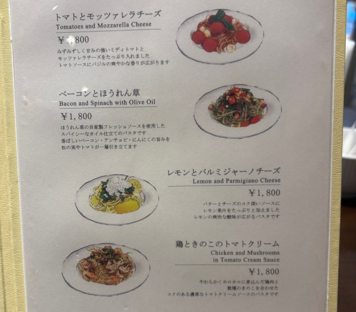 訪れたときは「トマトとモッツァレラチーズ」、「ベーコンとほうれん草」、「レモンとパルミジャーノチーズ」、「鶏ときのこのトマトクリーム」というラインナップだった。ちなみに、これらは1800円で単品注文も可能。