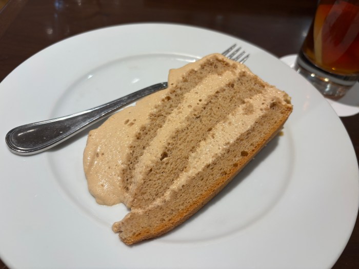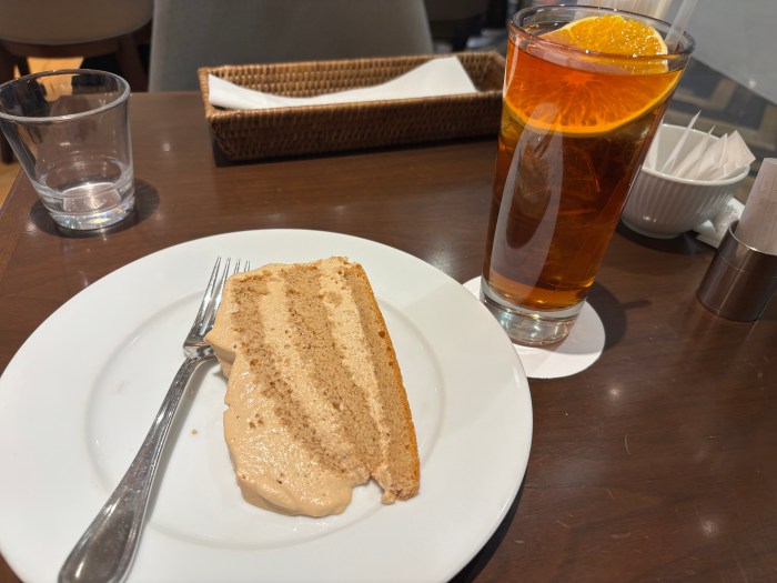 頼んだ「ロイヤルミルクティーケーキ」の見た目がシンプルだったので、なんか映えない感じになってしまって無念! 洋酒がしっかり効いた大人味で、スポンジはふわっふわで美味しかった!