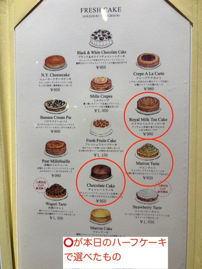 そして「本日のハーフサイズケーキ」は3種類の中から好きなものを選ぶ形。この日は「チョコレートケーキ」、「マロンタルト」、「ロイヤルミルクティーケーキ」から選べた。本日のデザートって1種類に固定されてるところも多いけど、選べるのはありがたい。