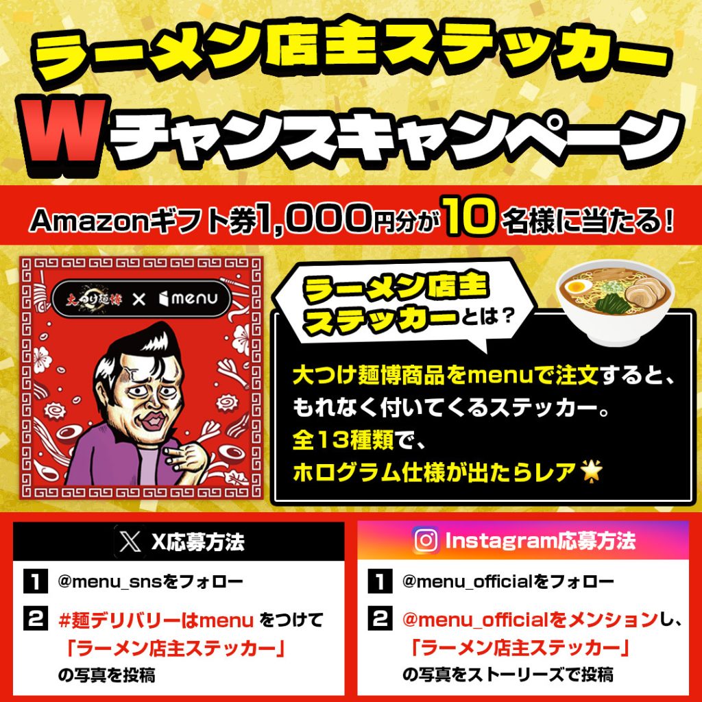X参加方法:menu公式X(@menu_sns)をフォローし、#麺デリバリーはmenuをつけて「ラーメン店主ステッカー」の写真を投稿。