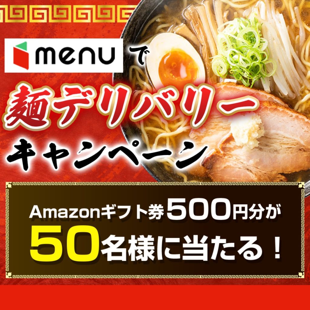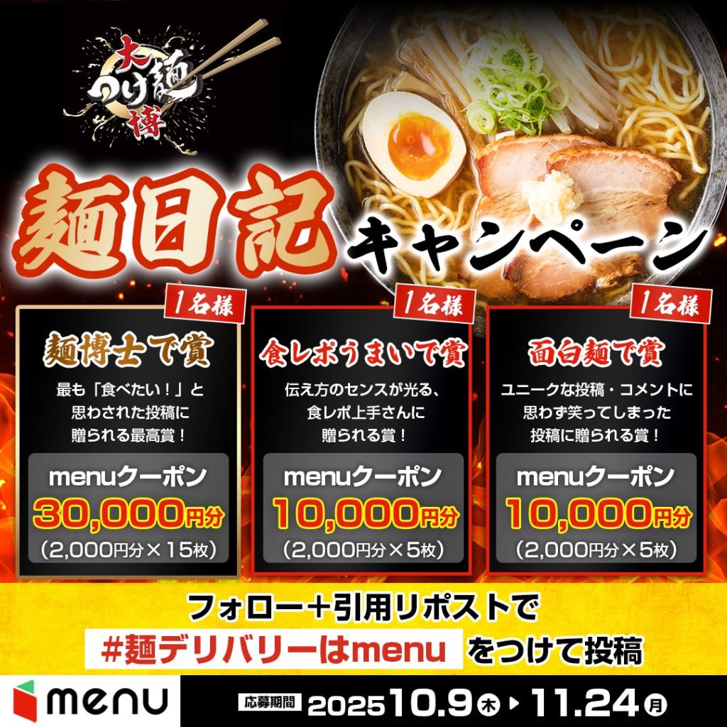 イベントの商品をデリバリー後、公式Xのフォロー& #麺デリバリーはmenu をつけて投稿でmenuクーポン最大30,000円分が当たる。