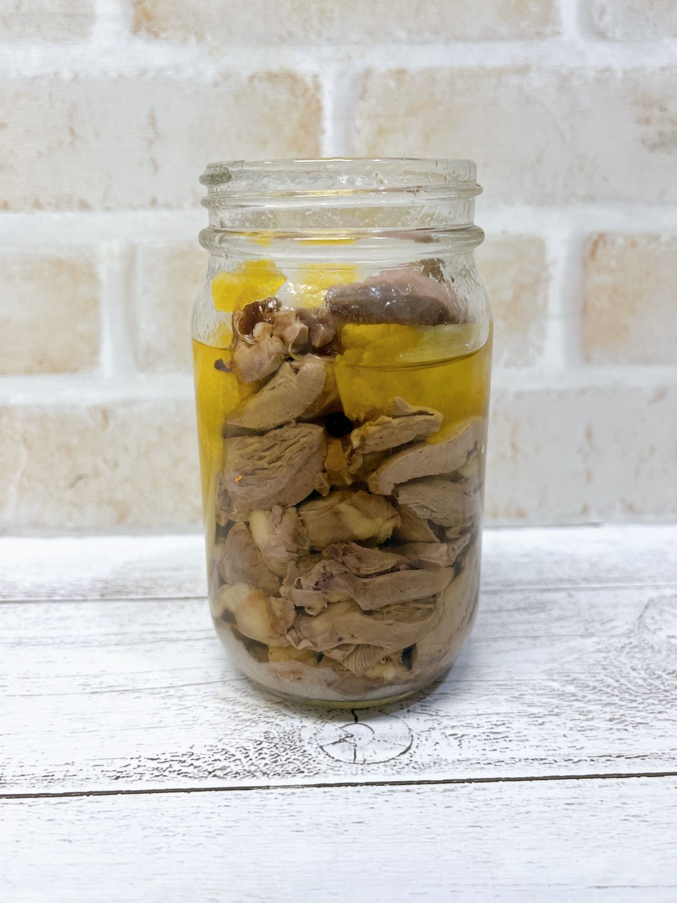茹でているので漬け込む油は少なめでOK!砂肝レモンコンフィ!