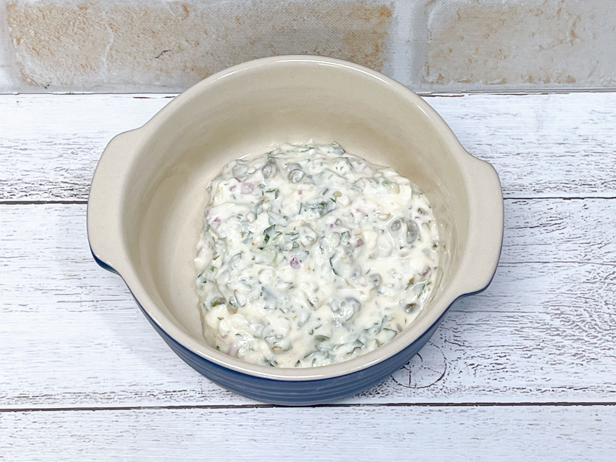 2)生クリームが固まってきたら、オリーブオイル、玉ねぎのみじん切り、イタリアンパセリのみじん切り、ケッパーのみじん切り、塩を加えて混ぜ合わせて完成!