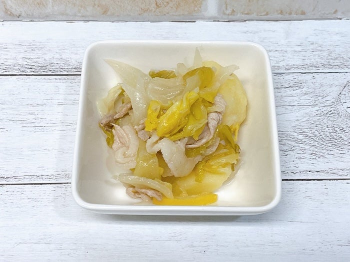 3)鍋に玉ねぎ、じゃがいもを加え炒め合わせたら、キャベツのレモン漬けと水を加え、蓋をして、じゃがいもがやわらかくなるまで煮ます。