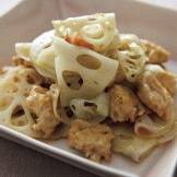 1. れんこんは皮をむき、1cm角に切る。トマトは1.5cm角に切る。たまねぎは縦に薄切りにする。