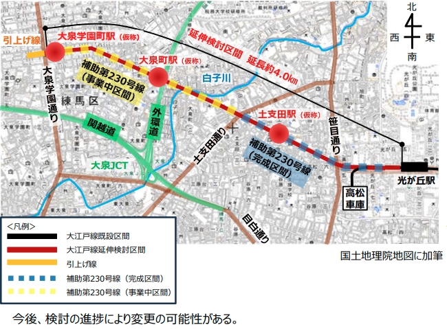 各駅の間隔は光が丘~土支田約1.5キロ、土支田~大泉町約1.4キロ、大泉町~大泉学園町約1.1キロを想定しています。土支田駅は土支田通りの東側付近、大泉町駅は外環道との交差部付近の西側、大泉学園町駅は大泉学園通りの東側に設置する案です。終点の大泉学園町駅に折り返し運転用の引上げ線を整備するほか、既存の高松車庫を改修する計画もあります。