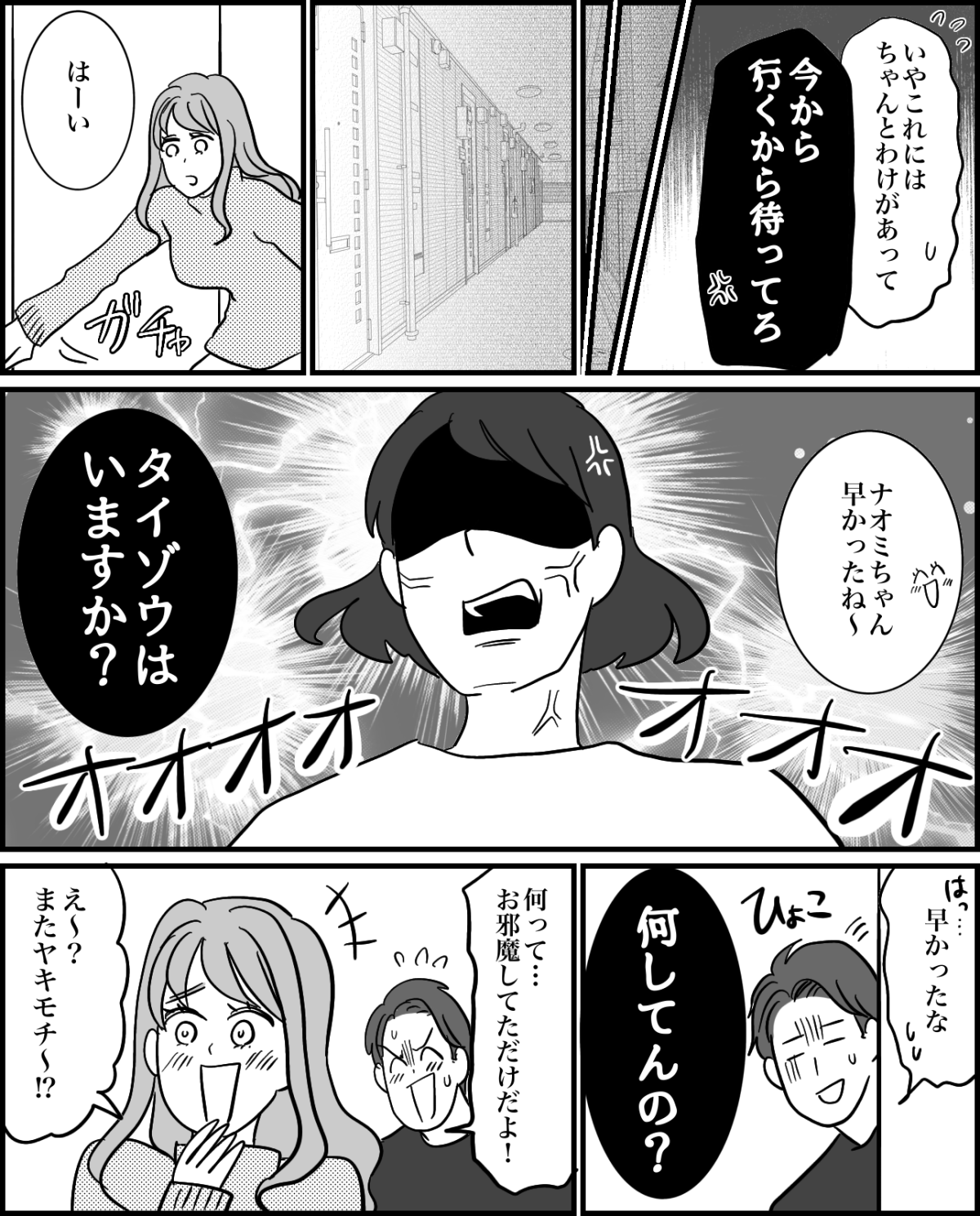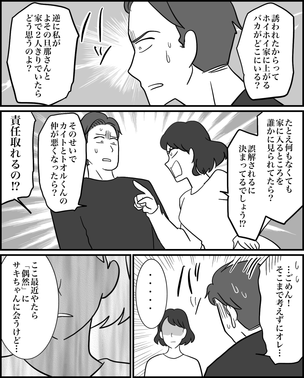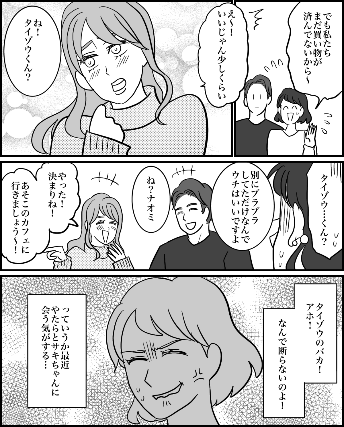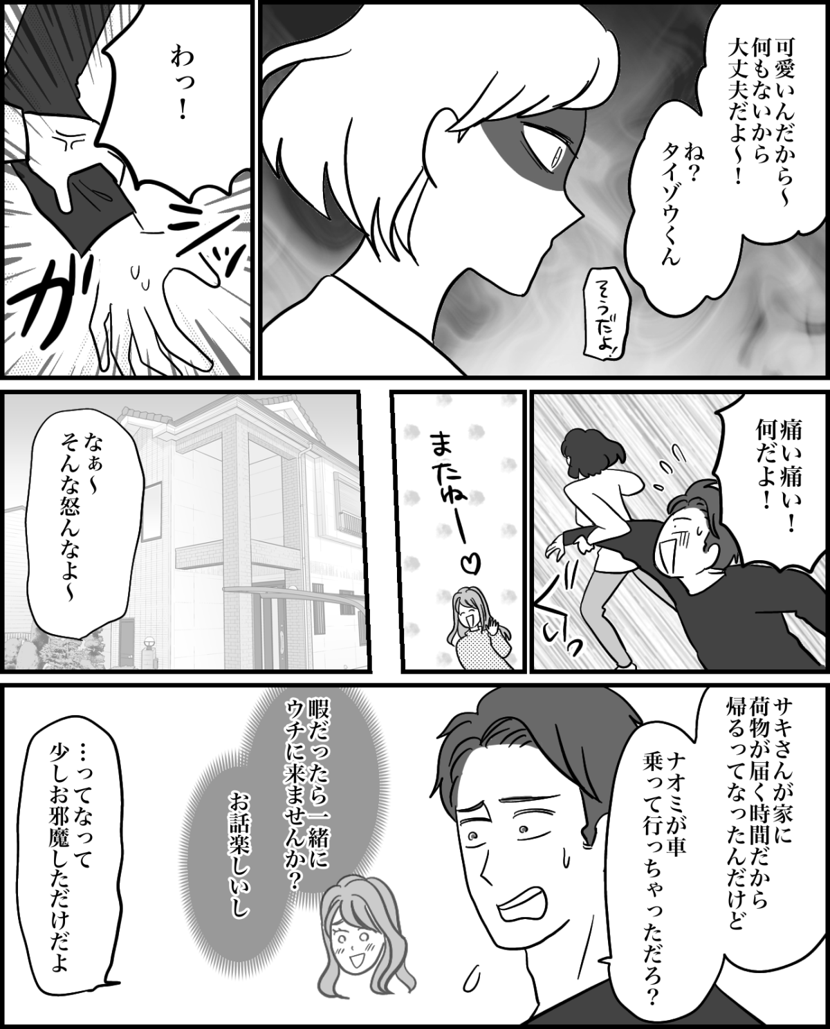 私はタイゾウの腕を引っ張って、その場を去りました。しかし怒っている私とは対照的に、タイゾウは何も考えていない様子。「もっと話したいからウチに来ませんか、ってサキさんが言うから、お邪魔させてもらっただけだよ?」