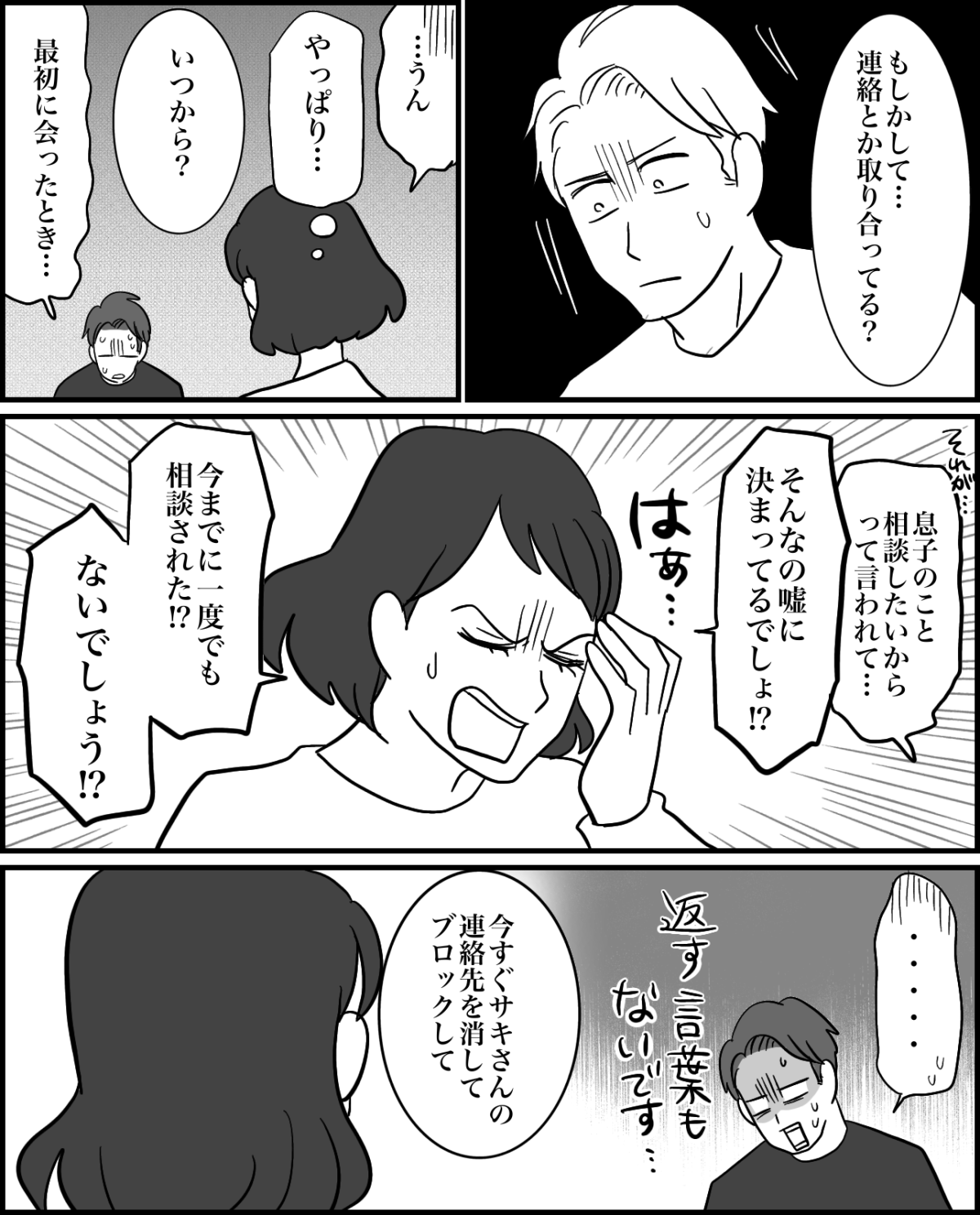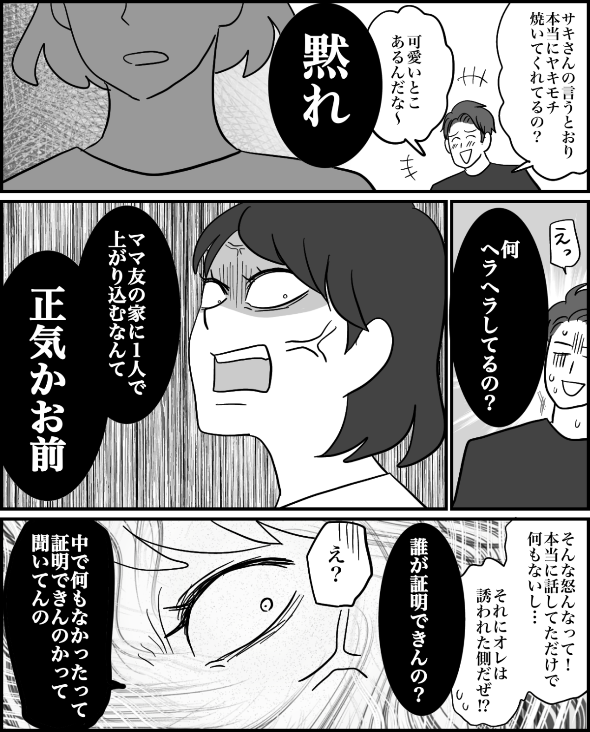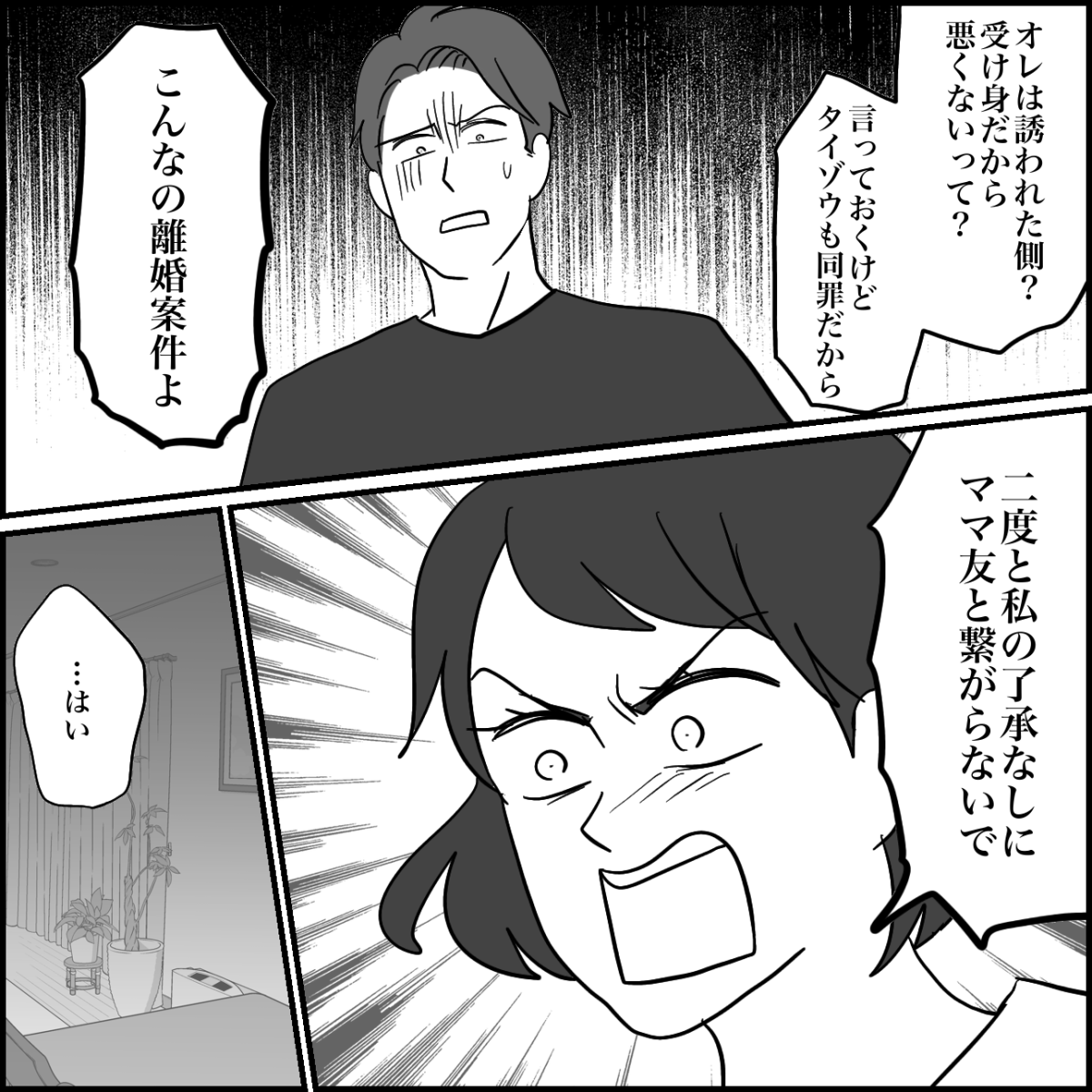サキちゃんから誘われるまま、家に上がり込んでしまったタイゾウ。しかもサキちゃんの言うことを真に受けて「ヤキモチ焼いてるの?」とヘラヘラしながら言う始末。自分のしでかしたことをまるで分かっていないタイゾウに、私の怒りは頂点に達していました。「オレは誘われただけだから悪くない」というような雰囲気を出していたけれど、タイゾウも同罪です。 その後私に叱り飛ばされたことで、タイゾウもようやくことの重大さがわかったようです。すぐに私の目の前でサキちゃんのことをブロックして、連絡先を消してくれました。サキちゃんはわかりませんが、少なくともタイゾウはこれで反省してくれるといいなと思います。