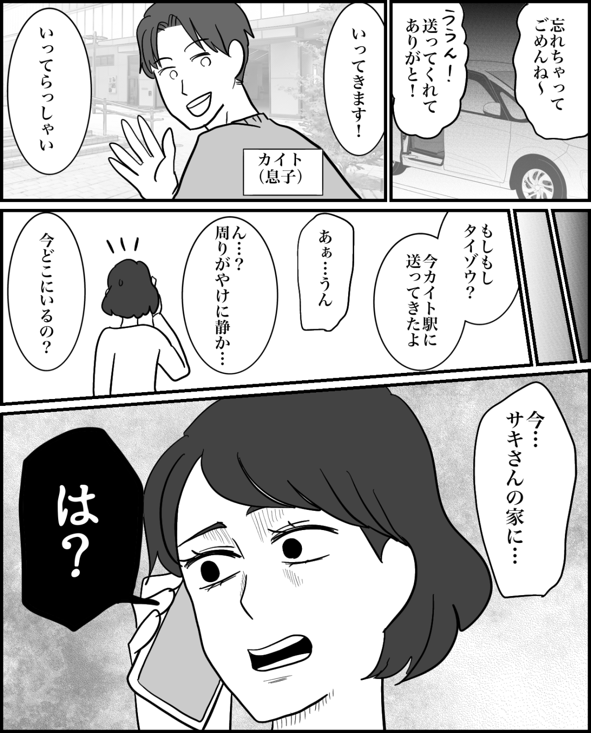 タイゾウも強く拒否しないので、なんだかモヤモヤします。思わず注意しようとすると、息子のカイトから電話がかかってきました。そういえば「夕方駅まで送ってほしい」と言われていました。時間が迫ってきたので連絡してきたようです。