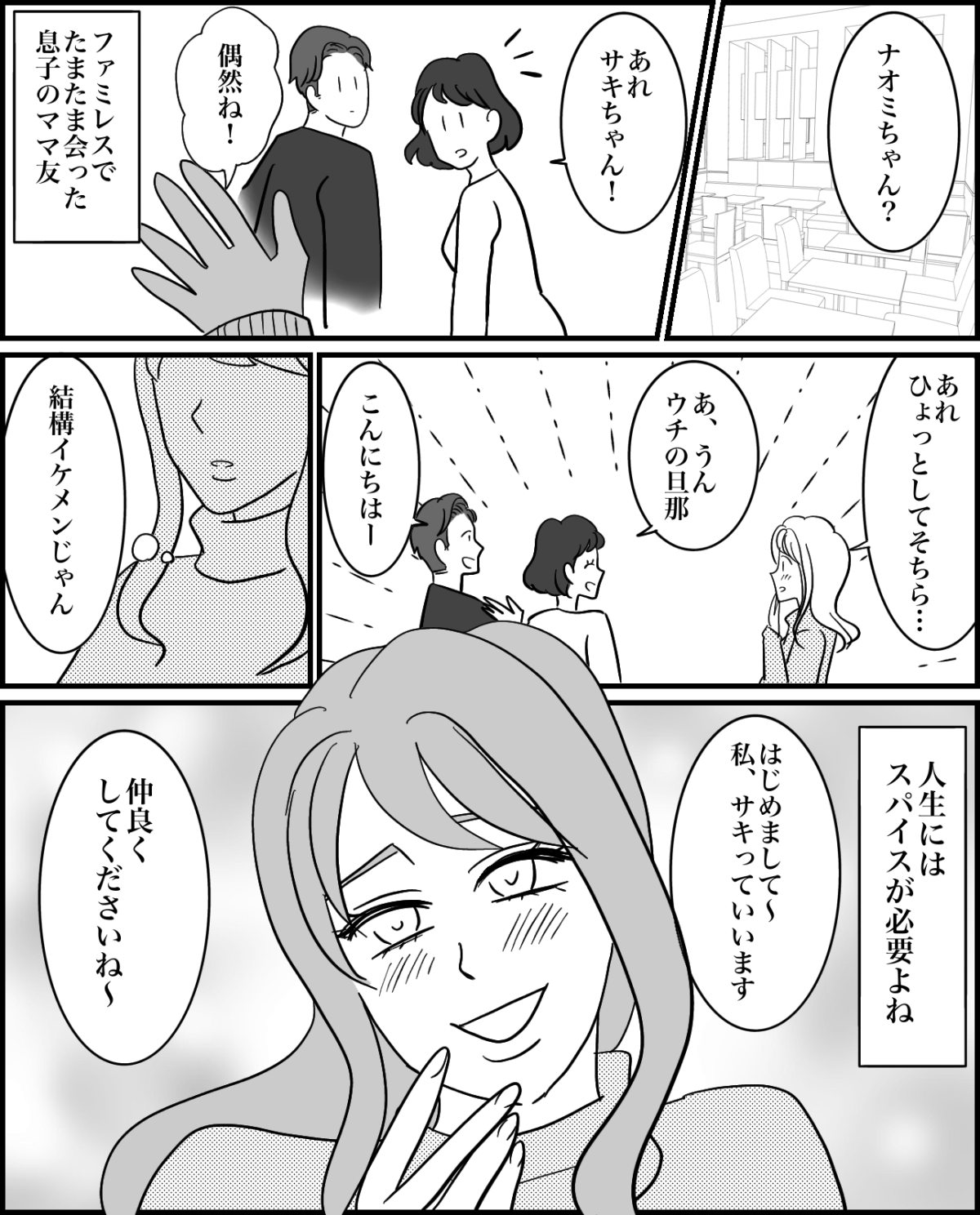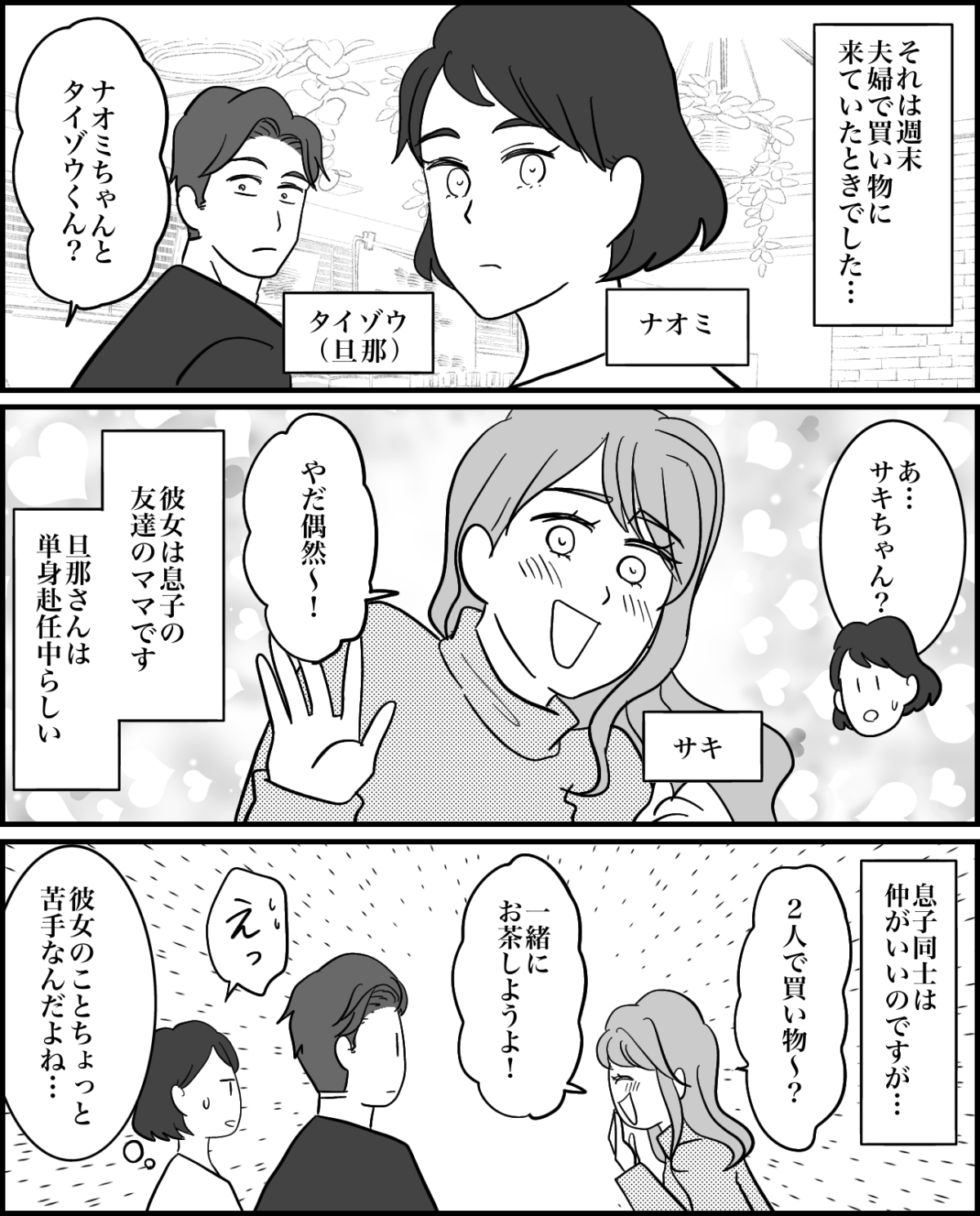 私はナオミ。息子のカイトが高校生になり、子育てに忙しかった時期と比べるとかなり生活が落ち着いたように思います。最近では旦那のタイゾウと夫婦だけで出かける機会も増えてきました。しかし気になることがひとつ。最近やたら「サキちゃん」と外出先で会うのです。サキちゃんはカイトの同級生、トオルくんのママ。昔から知り合いのママ友で、旦那さんはずっと単身赴任だそうです。ある日、夫婦で近くのショッピングモールへ行くと……。