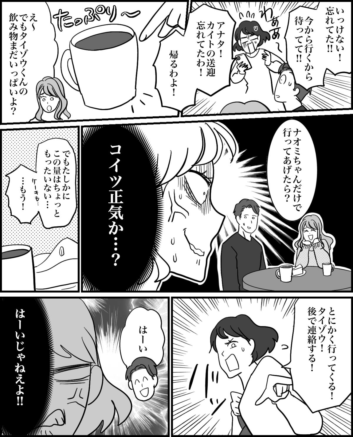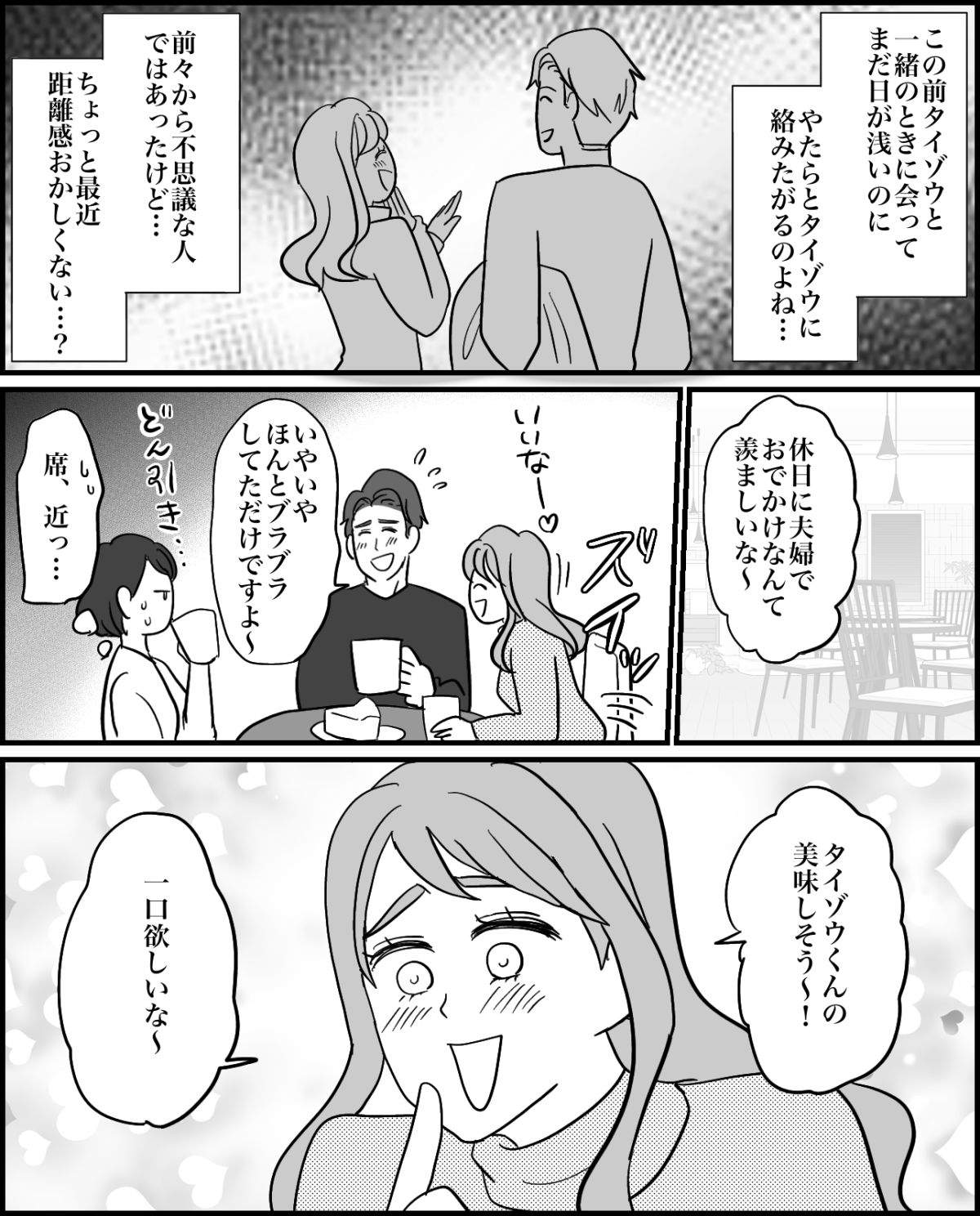 ママ友のサキちゃんは、最近どうもタイゾウに対してやたらベタベタしてきているような気がします。「タイゾウくん」と呼んだり、ドリンクを「ひと口ちょうだい」なんて言ったり、ママ友の旦那相手にやることなのでしょうか……。ちょっと信じられません。 しかも注意するたびに「ヤキモチでしょ?」と茶化されるので、嫌な気持ちになります。そんななか、私だけが急いで帰らなければならない状況に。私はムカムカしながら2人を残しその場をあとにしたのでした。
