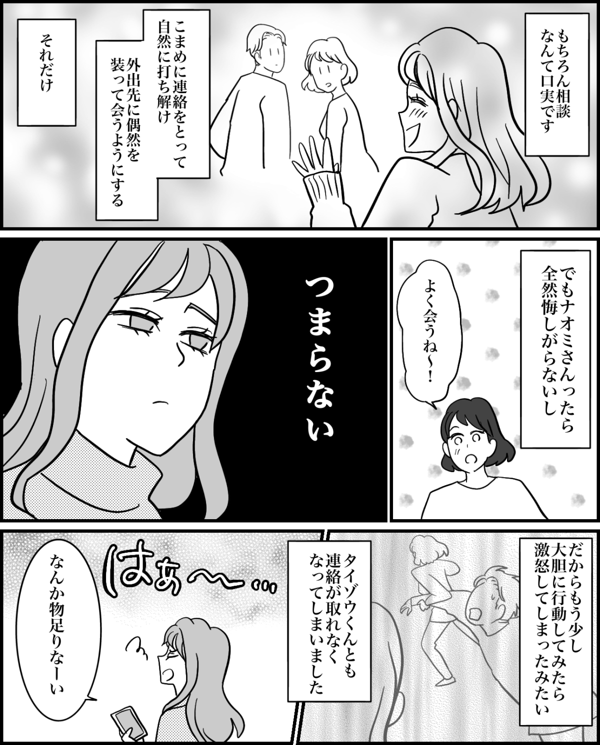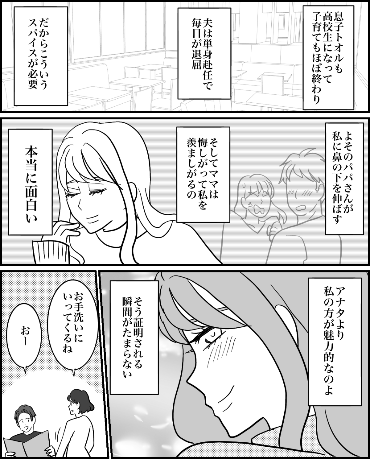 旦那は単身赴任だし、家庭のなかに存在感がありません。だからというわけではありませんが、私はよそのパパさんたちの気をひいて楽しんでいたのです。アプローチした旦那さんが鼻の下を伸ばし、私の方が嫁より上だと証明される瞬間がたまりません。次のターゲットはナオミちゃんの旦那のタイゾウくん……。 しかしタイゾウくんを家に連れ込んだところで、ナオミちゃんは激怒。少々やりすぎてしまったようで、タイゾウくんと連絡が取れなくなってしまいました。もう少し2人の仲をかき乱してやりたかったのに……! 私はさっそく次の手を考えています。