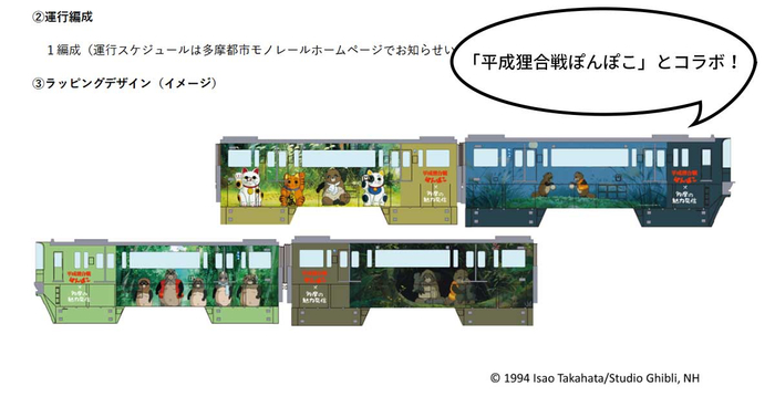 多摩丘陵が舞台のスタジオジブリのアニメーション作品「平成狸合戦ぽんぽこ」のラッピングモノレールが運行するようです。