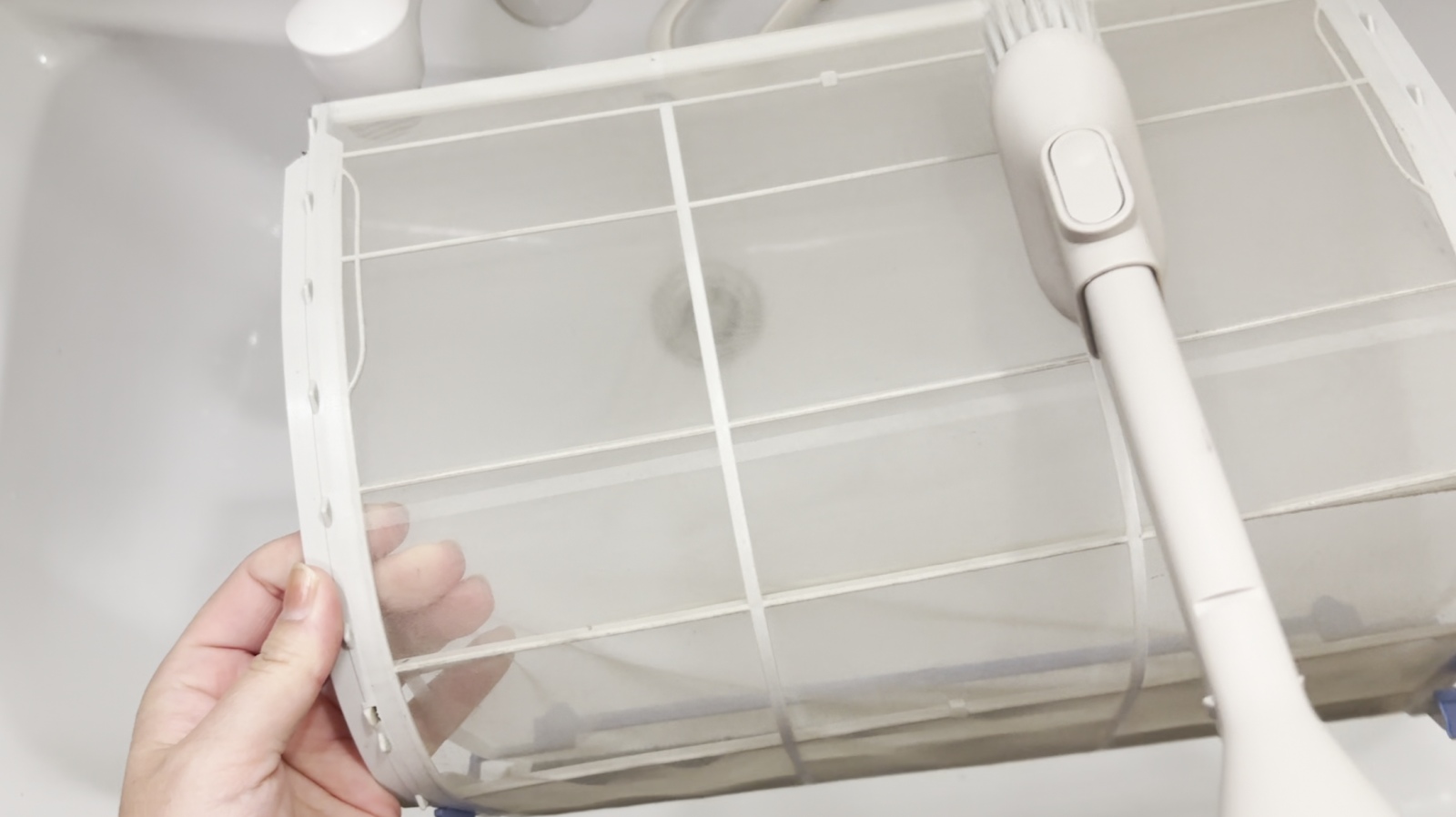 ブラシノズルを使って、フィルター表面についたホコリを軽く吸い取ります。このひと手間で水洗いがしやすくなります。