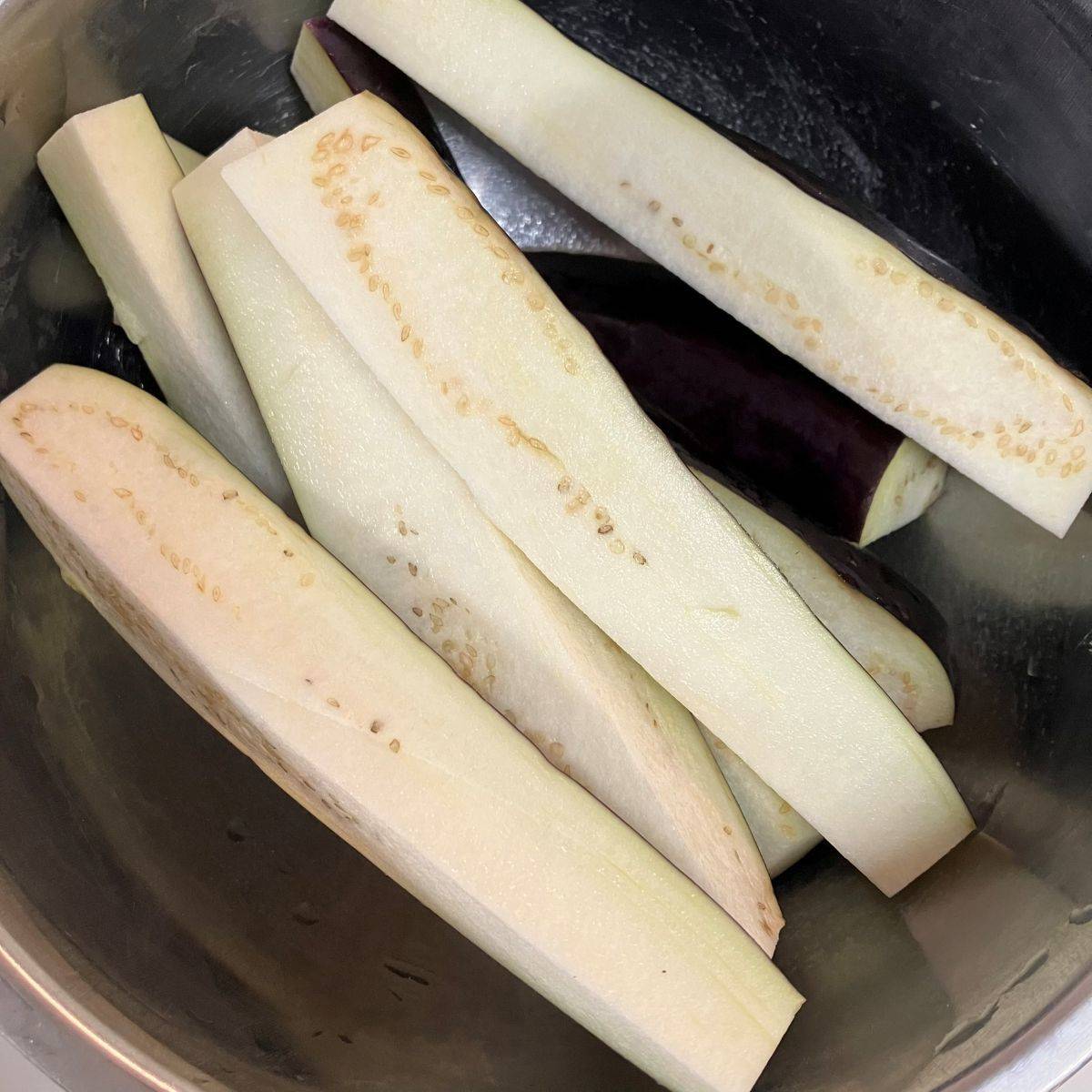 ナスは縦4等分に切ります。