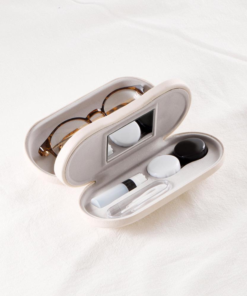 メガネとコンタクト用品を一緒に収納できるケースで、鏡付きでどこでもコンタクトを着脱可能です。また、装着時に使用するピンセットやスティックも付いており衛生的にも安心です。