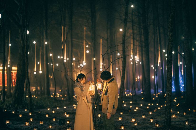 温かい光が灯る「ランタンキャンドルの森」で、ランタンを手に散策。幻想的な景色を眺めながら非日常の体験を楽しんで。