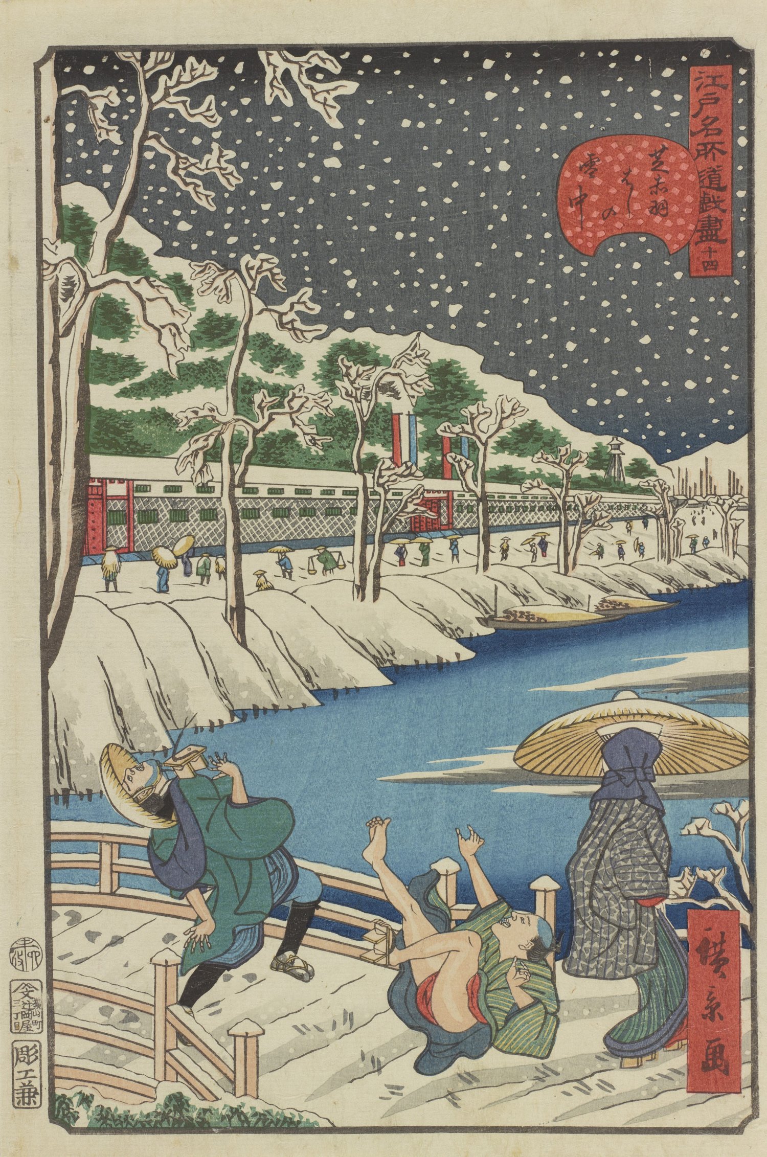 浮世絵の専門家の間でもほとんど知られていない絵師・歌川広景。それにもかかわらずSNSに作品が投稿されると大きな反響を呼ぶ、そんな広景作品の知られざる魅力に迫る「歌川広景 お笑い江戸名所」が2025年11月14日(金)~12月14日(日)、東京都渋谷区の『太田記念美術館』で開催される。TOP画像=歌川広景 「江戸名所道戯尽 廿二 御蔵前の雪」。