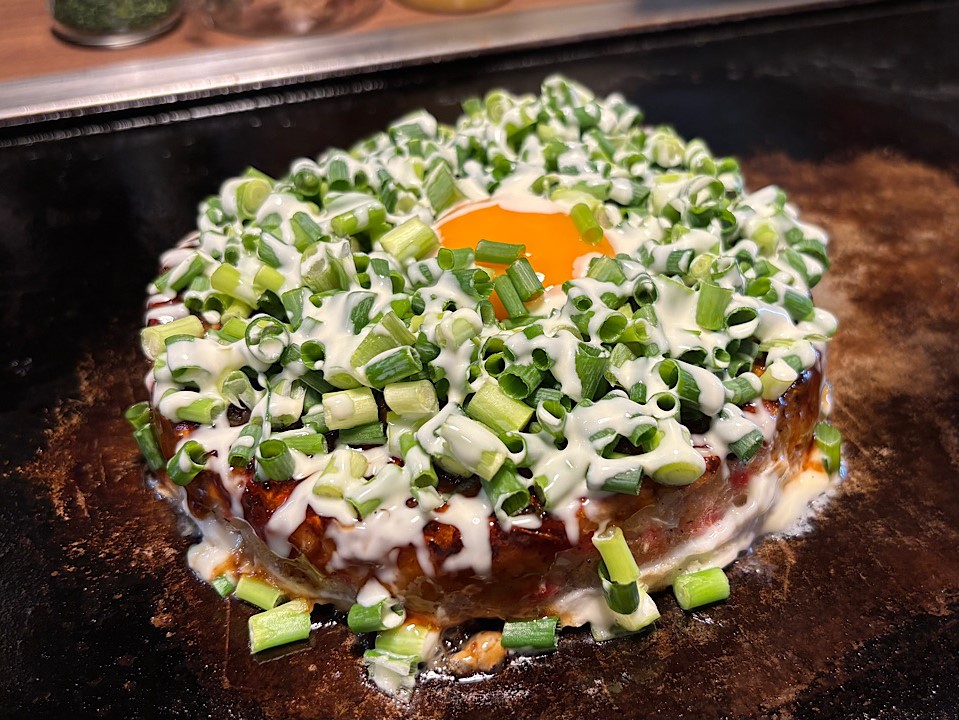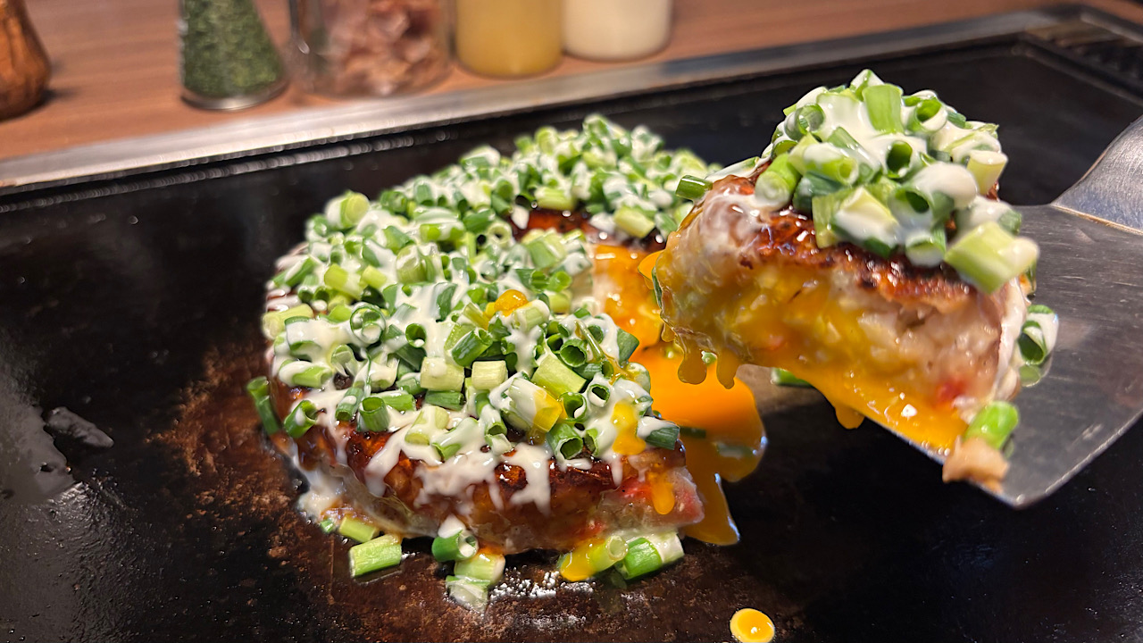 崩れた卵黄をまとったお好み焼きは、横から見るとご覧の通りの厚み。