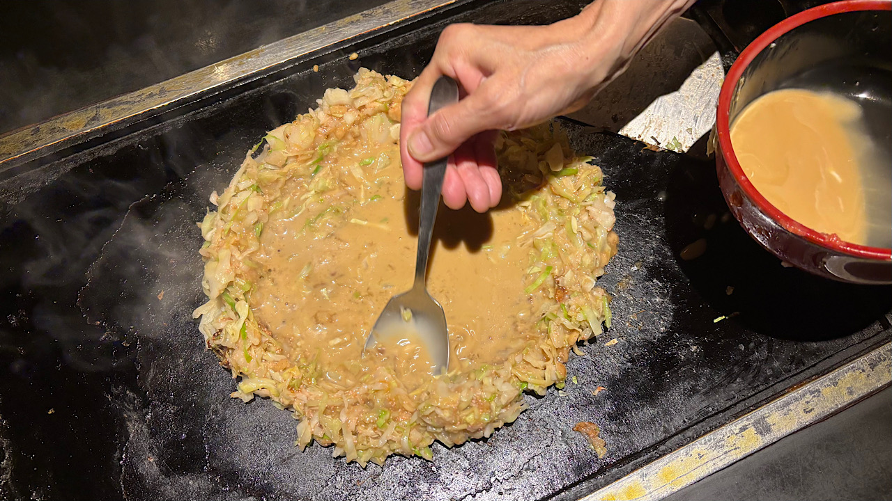 もんじゃ焼きのこだわりをたずねると、「こだわり…がないのがこだわりですかね」と茶目っ気たっぷりに微笑む松本さんですが、味の決め手となっているは、小麦粉を溶く“だし汁”にあるんだそう。