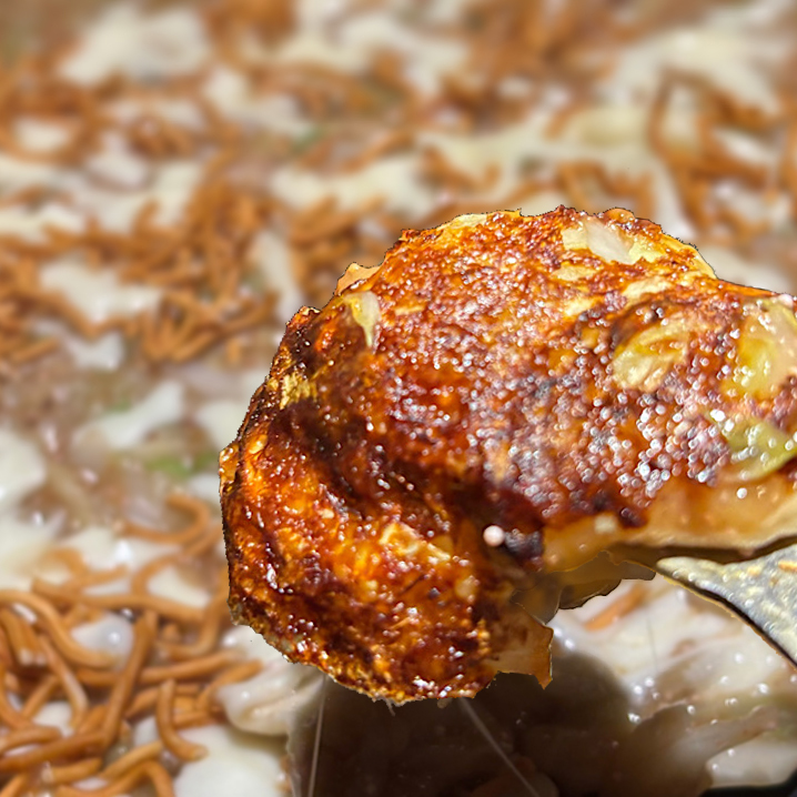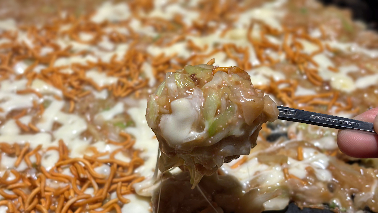 さらに明太子とチーズが深みをプラス、スナック麺が食感をおもしろいものにしてくれます。プチプチした明太子や溶けたもちの弾力も楽しめます。
