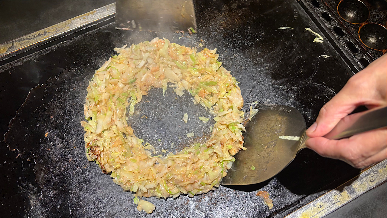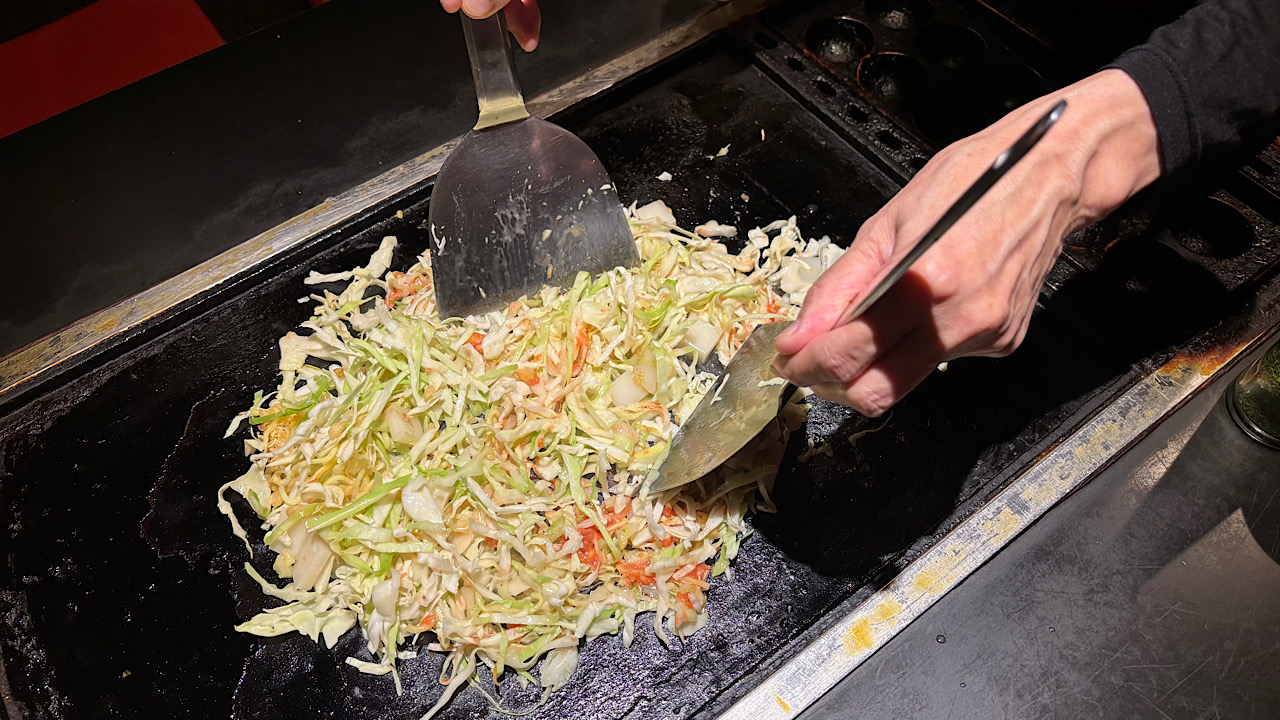 もんじゃ焼に負けず劣らず人気のお好み焼にも、特製の鶏ガラ&豚骨スープが入っているんだそう。