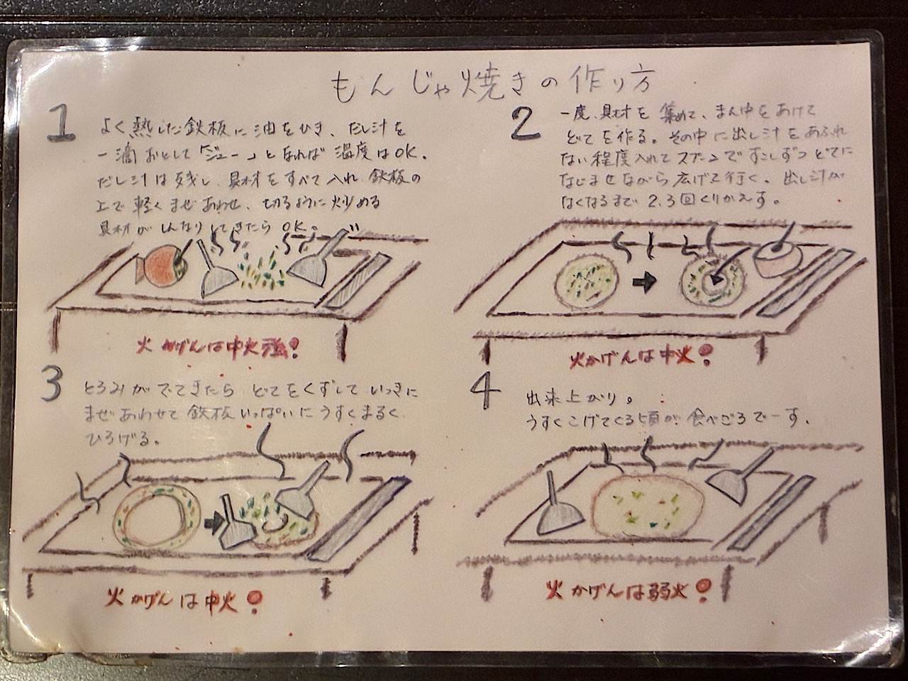 あまりに山盛りなので、こぼさずにちゃんと調理できるか心配ですが、そんな不安もあわせて調理を楽しむのが鉄板焼き。各テーブルには手書きのマニュアルが用意されているので、手順にしたがって作っていきましょう。