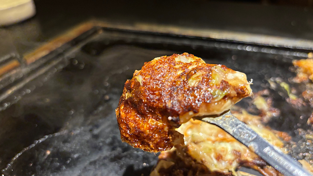 焦げ具合を好みで調整し、アツアツのヘラごと絡めとれば、最後までおいしく満喫できます。