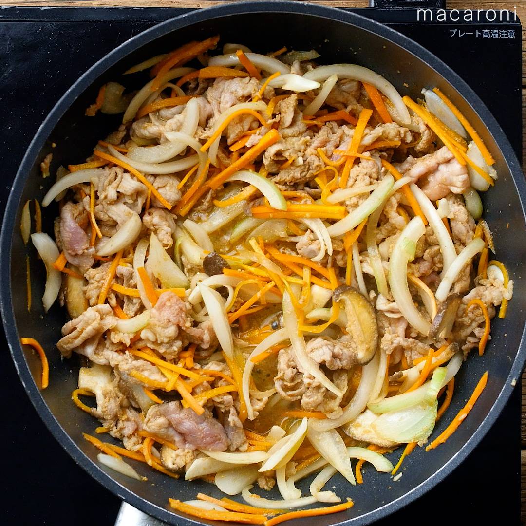 3: フライパンに②のつけだれごと入れ、中火にかけて豚肉に火が通るまで炒め煮にします。