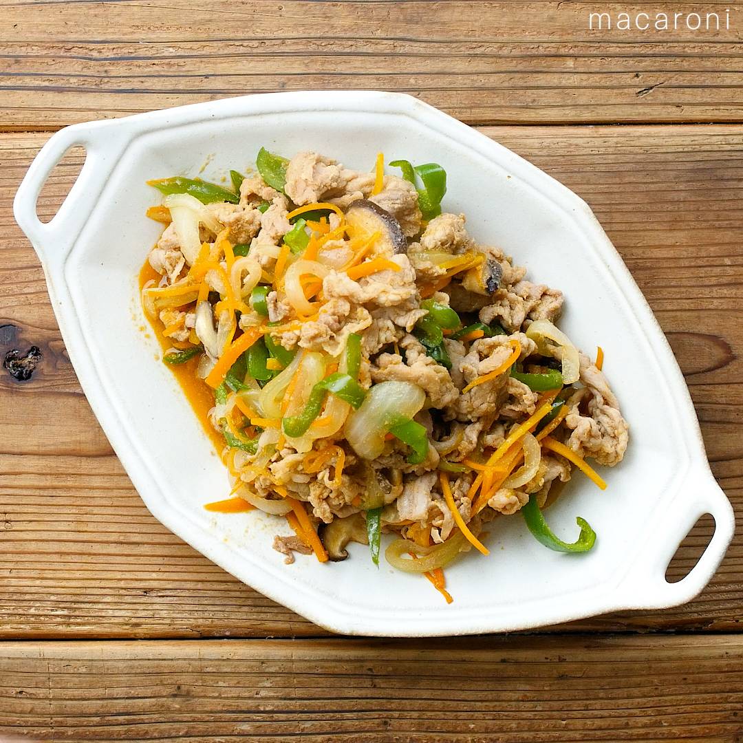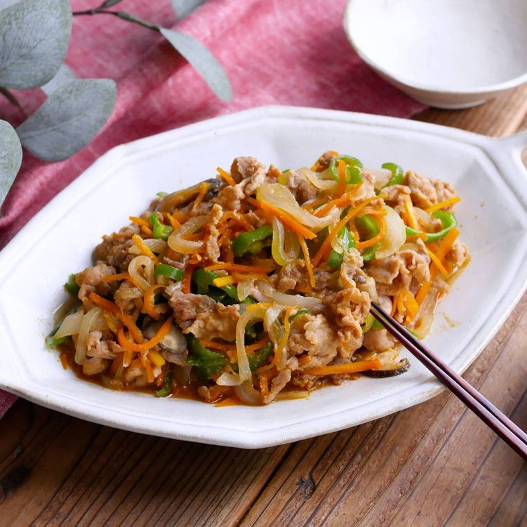4: 豚肉の色が変わり、火が通ったらピーマン、しいたけを加えて強火にします。水分が少なくなって全体に絡んだら、器に盛って完成です。