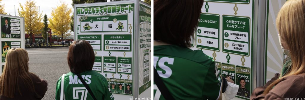 来場者の視線を集めていたのは、選手紹介パネルを軸に構成された「推しヴェルディ発見ブース」だ。選手が最近買ったもの、いまハマっている習慣、ちょっとした個人的エピソードなどが一覧化され、そこに“推しヴェルディ診断チャート”が加わることで、来場者は自分の“推し選手”を探す行為そのものをゲームとして楽しむことができた。パネルの前では「こんなこと書いてあるんだ!めっちゃおもしろ!」という声も多く聞かれ、ブースの前では写真撮影や友人同士での診断トークが続くなど、終始にぎやかな盛り上がりを見せていた。