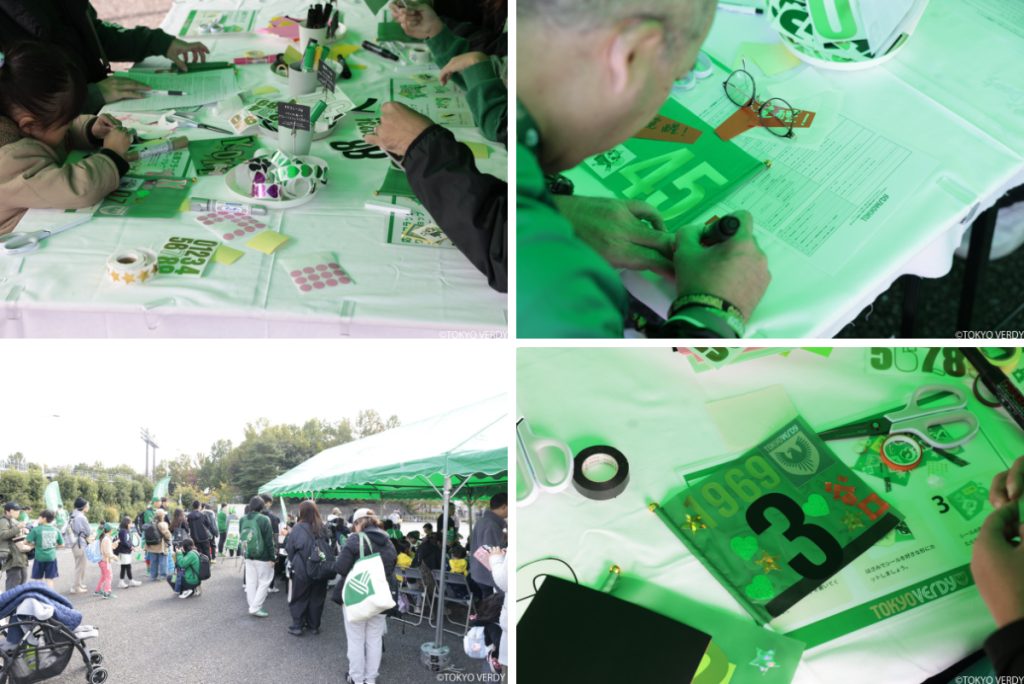 先着250名限定の応援フラッグワークショップにも長い列ができた。参加者は文字シールやモチーフを選びながら、自分だけの旗を制作する。「これがいいかなあ」「こうするとかっこいいかも!」といった対話は、作品づくりよりも“共に時間を過ごすこと”それ自体が目的化していた印象がある。そして完成した旗を手にスタンドへ向かう瞬間、そこには「観客」から「チームを支える存在」へ移行する小さな線引きが芽生えている。旗は単なる紙ではなく“スタジアムに属する自分の証”として機能するのである。