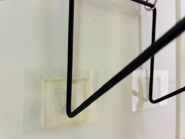 フックに引っかけたワイヤースタンドの下の両角が当たる位置に、耐震マットを貼りつけます。