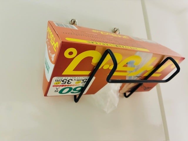 ワイヤーラックに逆さにセットすると、アイラップの箱の形にピッタリとフィットして、まるで専用ホルダーのようです。下からポリ袋を引き出す際に少し力がかかるため、磁石はネオジム磁石のような超強力タイプをお使いくださいね。
