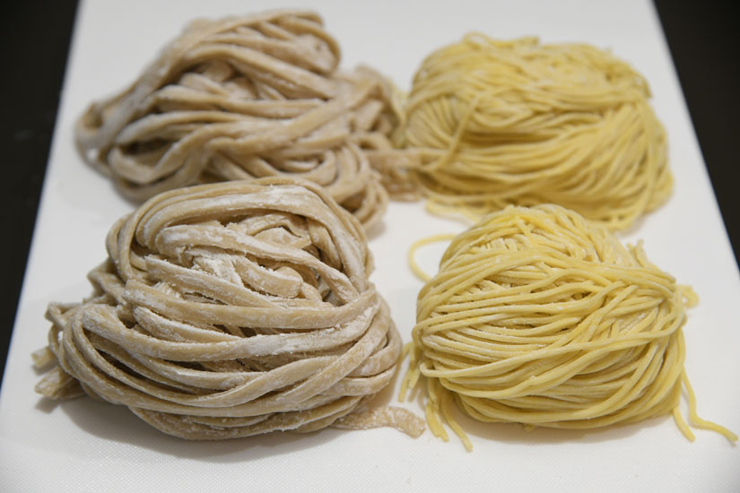 麺は特注のオリジナル麺。ラーメンの麺は中細ストレート麺(右)。パキパキとした歯触りが特徴でスープともよく絡みます。まぜそば用の超極太麺(左)は、もちもちとした食感。