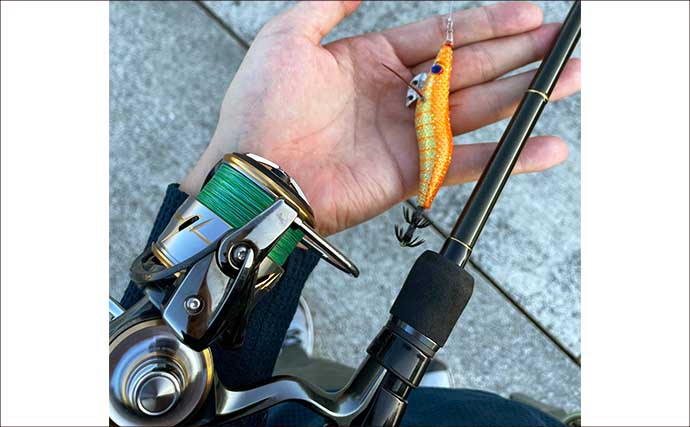 夕マヅメに入ると、周囲の様子を伺いながらエギングを始めた。私はルアーなので、横に入っていたエサ師にタチウオがついてから自分もそちらに切り替えようと思ったのだ。しかし、残念ながらエギングは1バラシで終了。完全に油断していた回収間際のタイミングで大アワセしてしまいスッポ抜けた。