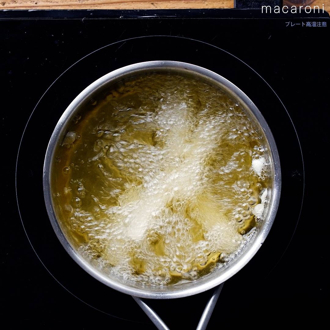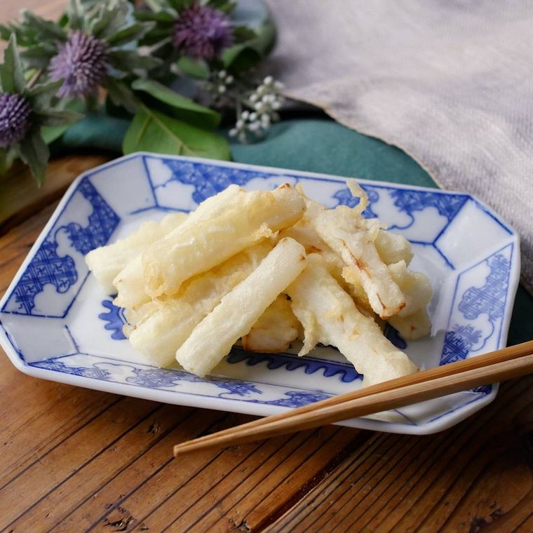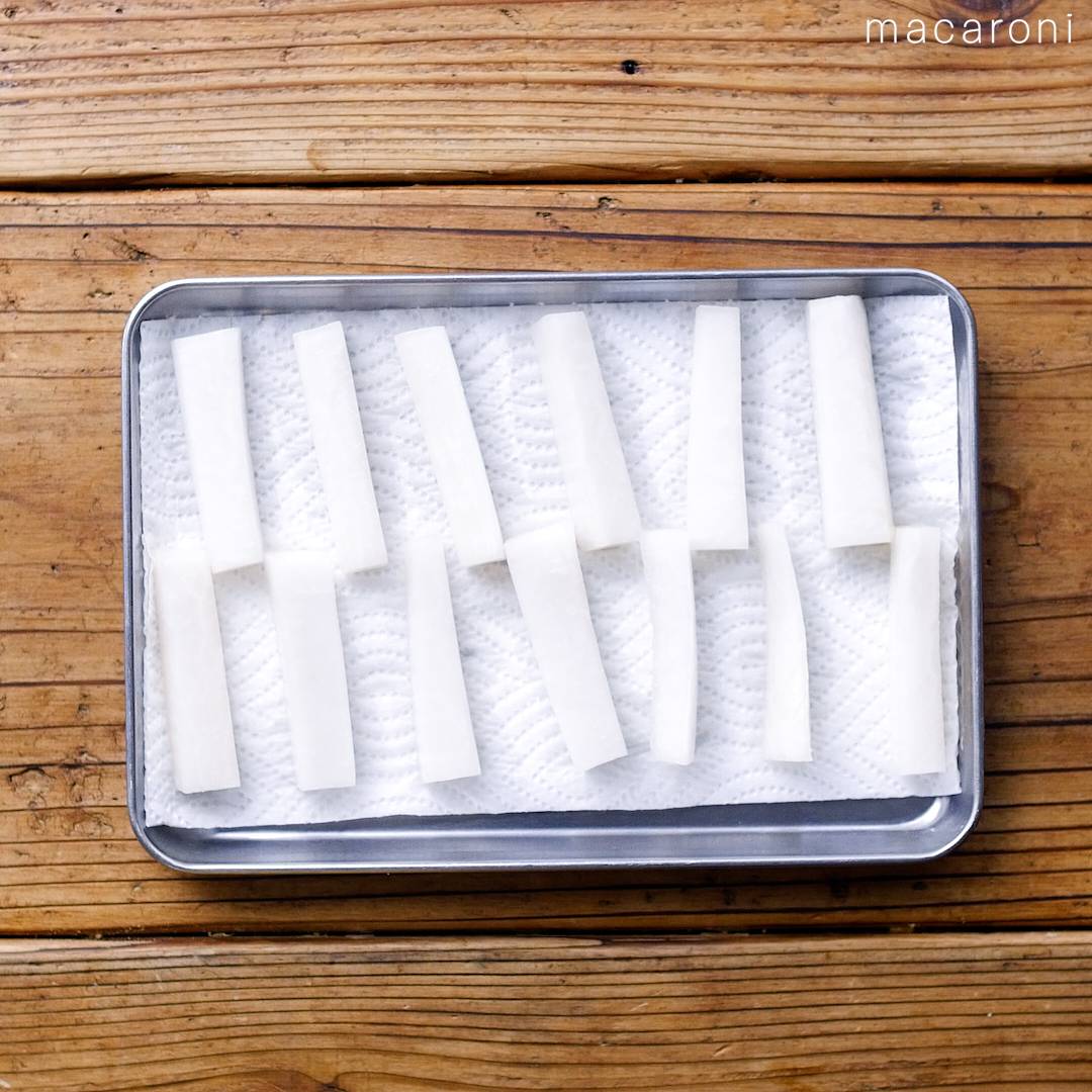 5: 鍋にサラダ油を入れて180℃に熱し、大根を入れてカラッとするまで2〜3分揚げます。油を切って器に盛り付けたら完成です。