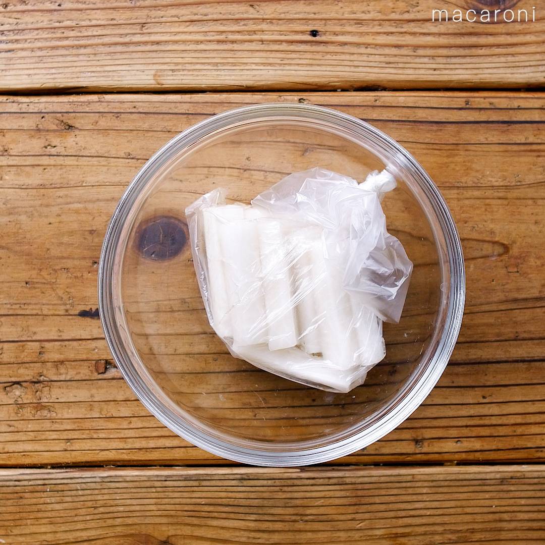 1: ポリ袋に大根、白だしを入れて揉み込み、10分ほど置きます。