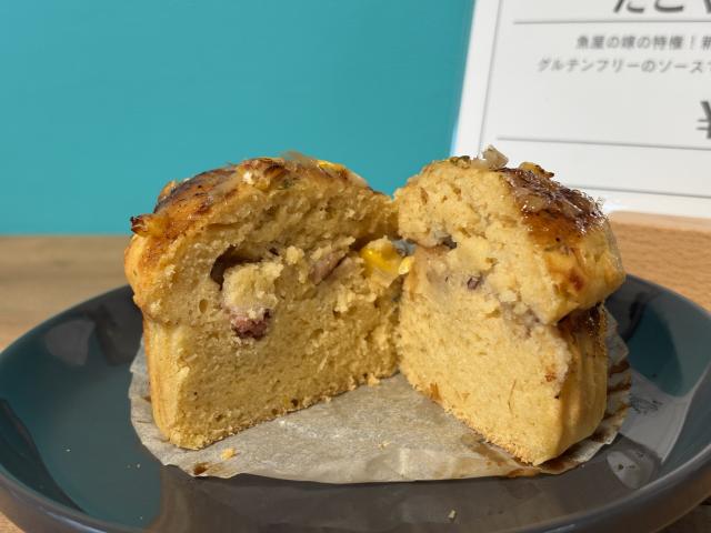 夫が営む魚屋さんから仕入れた新鮮なタコを使用し、グルテンフリーのソースをかけて焼き上げたマフィンは、まるで本物のたこ焼きのよう。