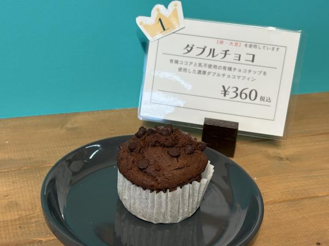 お店の一番人気は「ダブルチョコ 360円(税込)」。ココアとチョコチップを使った、濃厚なチョコ味のマフィンです。
