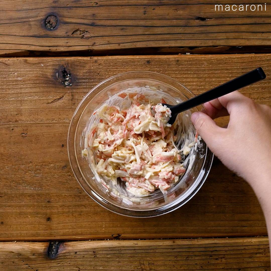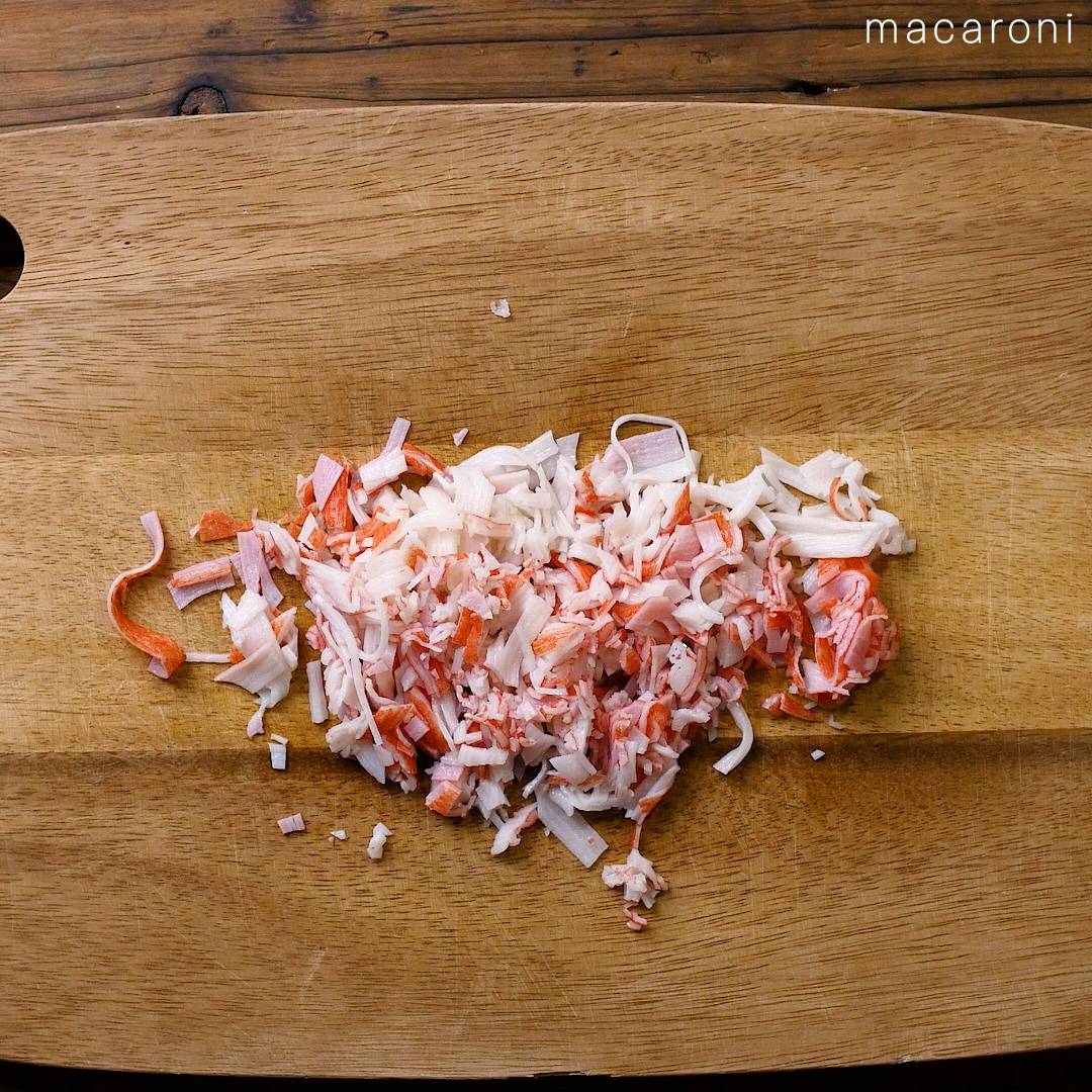 1: カニカマは手でほぐし包丁で刻みます。