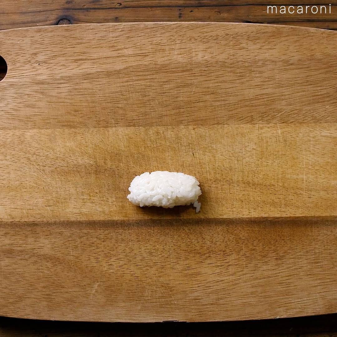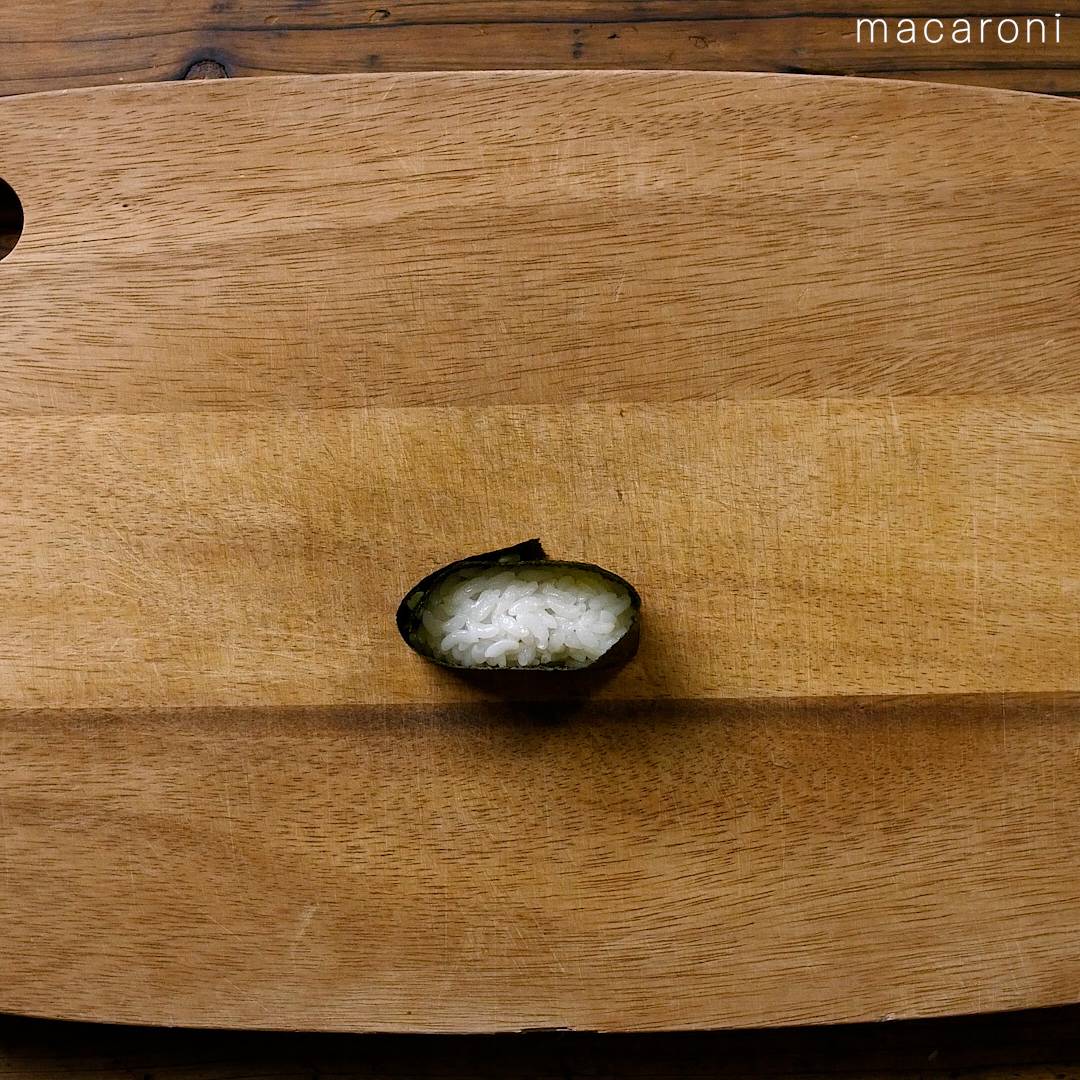 5: 酢飯をラップでシャリの形に整えます。切った焼き海苔を巻きつけ酢飯で止めます。