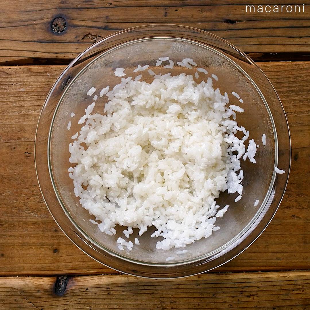 米酢、砂糖、塩を混ぜ合わせ、ごはんに加えて混ぜ合わせます。