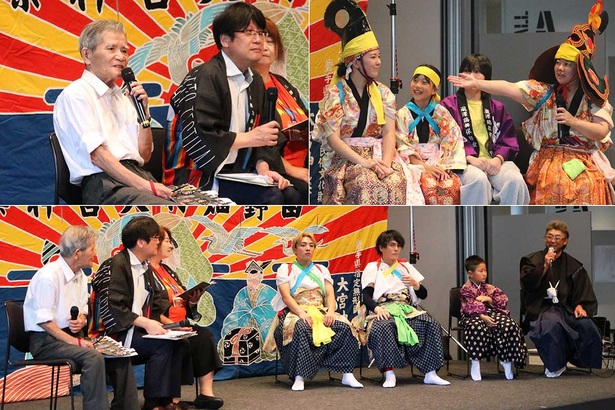 5日は、若手芸能者が創造的な芸能継承について語り合う公開ディスカッション「三陸芸能ユースミーティング」を皮切りに各種プログラムが夕方まで続いた。「東北の百姓一揆と芸能」と題したプログラムでは、死者への祈りが込められた供養芸能として、瀧澤鶏舞(洋野町)、救沢念仏剣舞(岩泉町)、大宮神楽(田野畑村)が披露された。岩手の百姓一揆や民俗芸能研究で知られる茶谷十六さんと岩手県立図書館長の森本晋也さんが解説。一揆と芸能の関係性について、「日本最大級の三閉伊一揆の中心的指導者の多くは神楽など芸能の名手だった」という古文書の記録を紹介。茶谷さんは「岩手には凶作、飢饉で何万人もの人が亡くなった悲しい歴史がある。その悲しみを共有し、亡くなった人を供養するというのが岩手の芸能の原点ではないか。豊作祈願の田植え踊りで刃物を持って踊るのは圧政を許さない、自分たちの命を守るために戦うという覚悟の表れ」と話した。