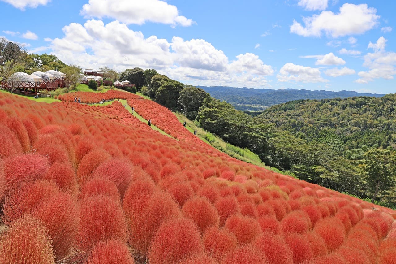 マザー牧場のまきばエリア「花の大斜面・東」を彩るのは約8000株ものコキア。畑が誕生して4年目となる今年は、季節ごとに違った彩りを見せるコキアの風景が、来場者を楽しませていました。