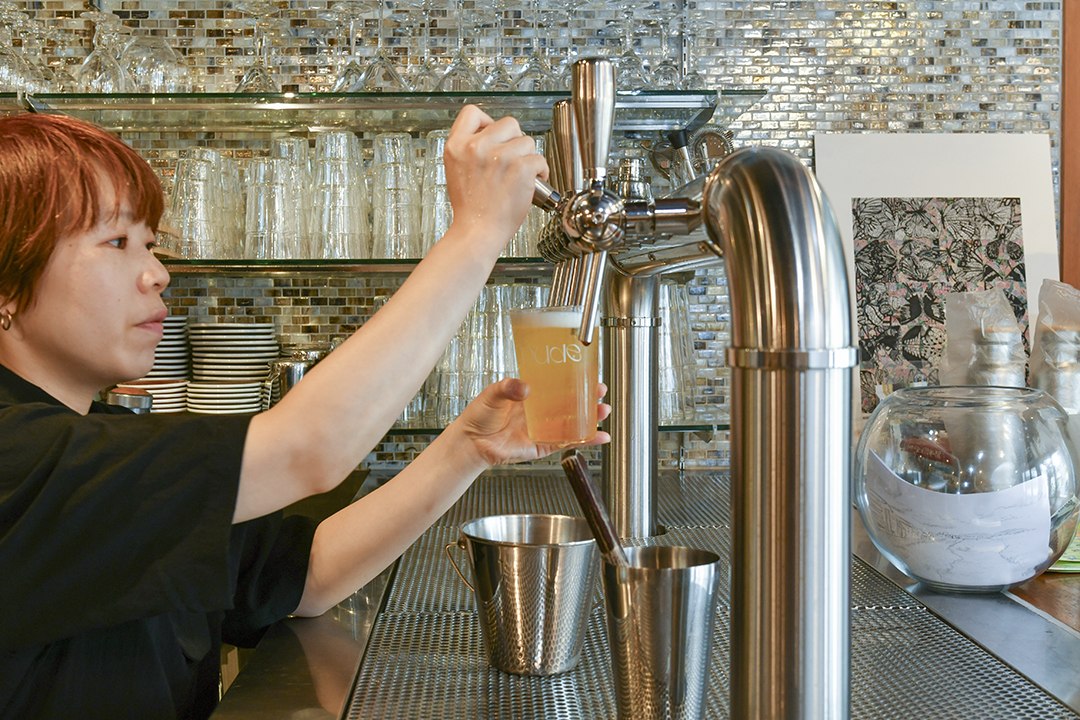 店の醸造所「KYOTO NUDE BREWERY」で醸造したオリジナルブランド「NUDE BEER」のビールもいくつか用意。取材時のおすすめは、アメリカンペールエールの「SEISOU-星霜-」。アメリカンペールエール本来の味わいや香りが伝わるよう、ビールだけでも満喫できるほどの、存在感のある風味に作り上げている。鼻を爽やかに抜けるフルーティな香りのあと、爽快な後味が続き、思わず次の一口が飲みたくなるおいしさが魅力的。