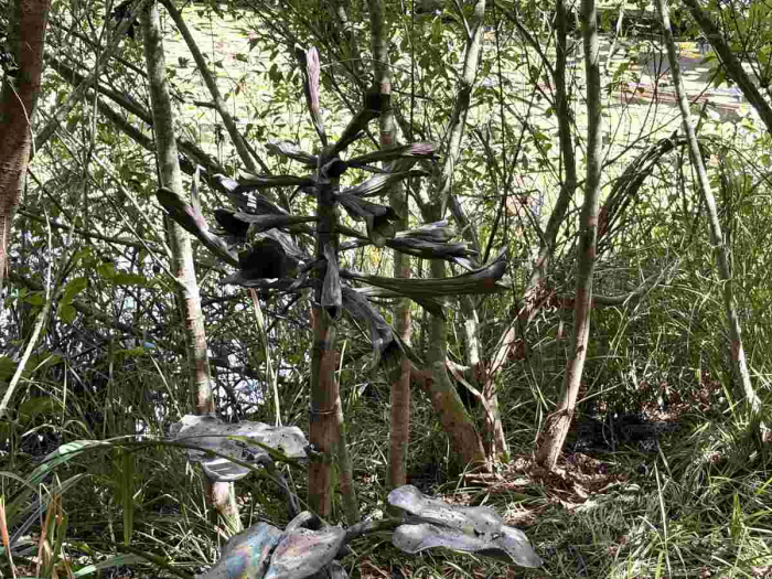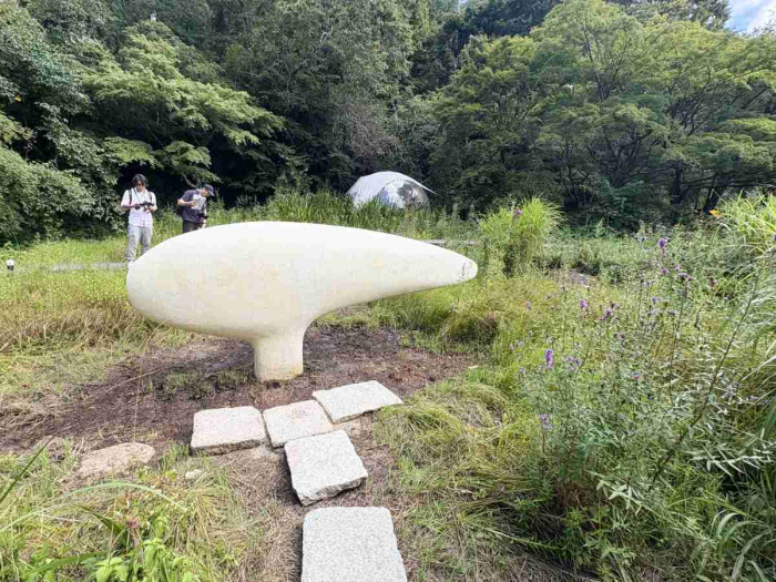 続いて進むと、『やなぎみわ』の鋳造作品「大姥百合(オオウバユリ)」。深く緑が生い茂るなかにたたずむ様は、目を凝らさないと気付かないほど自然と一体化しています。