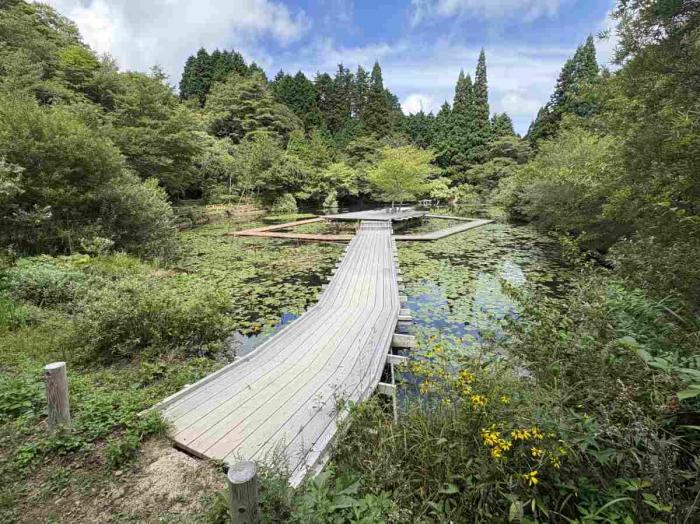 まず見えてきたのは『川俣正』による「六甲の浮き橋とテラス Extend 沈下橋2025」。3年連続の出展で、今年は沈下橋を延長してテラスを取り囲むようにしたそう。ただ、今年の猛暑と日照りのため、橋が沈下していない状態が続いているとか。